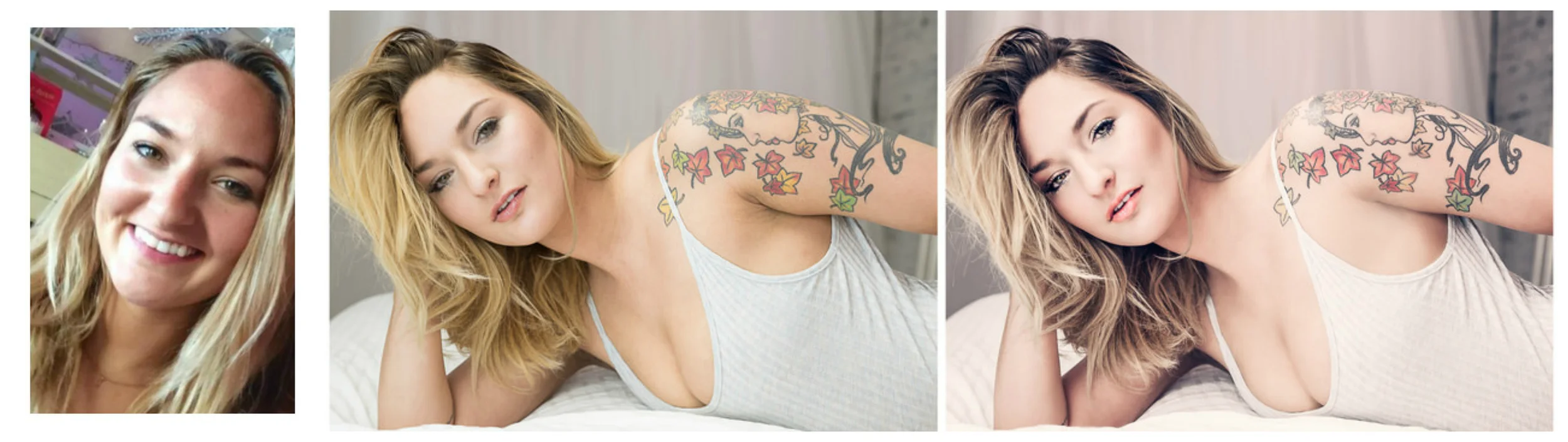 LEFT TO RIGHT: BEFORE SESSION, STRAIGHT OUT OF THE CAMERA SHOT, EDITED FINISHED PHOTOGRAPH